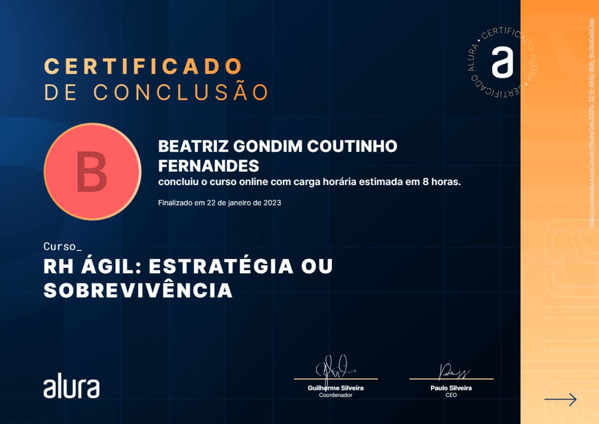 “Trabalhei com Beatriz por aproximadamente 6 meses dentro da área de people e posso garantir que ela é uma profissional completa! Além de todas as competências técnicas de gestão de pessoas, desenvolvimento profissional e visão estratégica, também possui importantes soft skills de empatia, cooperação, proatividade, comunicação, criatividade e uma que considero extremamente importante nesse mundo tão volátil em que vivemos atualmente: adaptabilidade. Aprendi com ela a me adaptar às diversas situações dentro do trabalho e acredito que essa é uma de suas maiores qualidades.